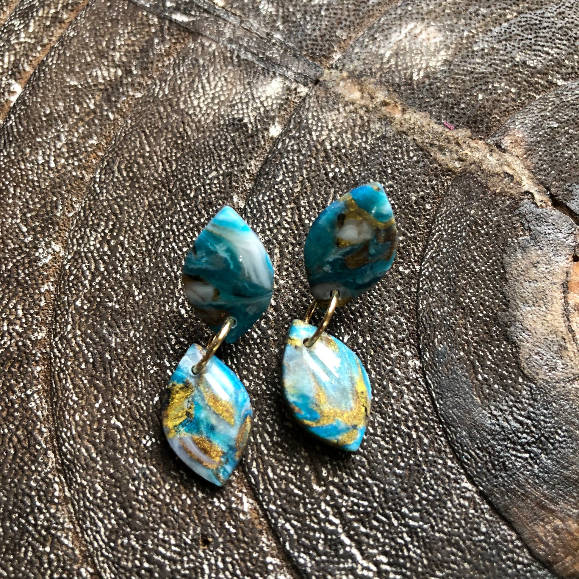 Various shades of clay marbled with liquid clay and gold leaf sheet. The posts used are made from surgical stainless steel, a great option for those with sensitive skin