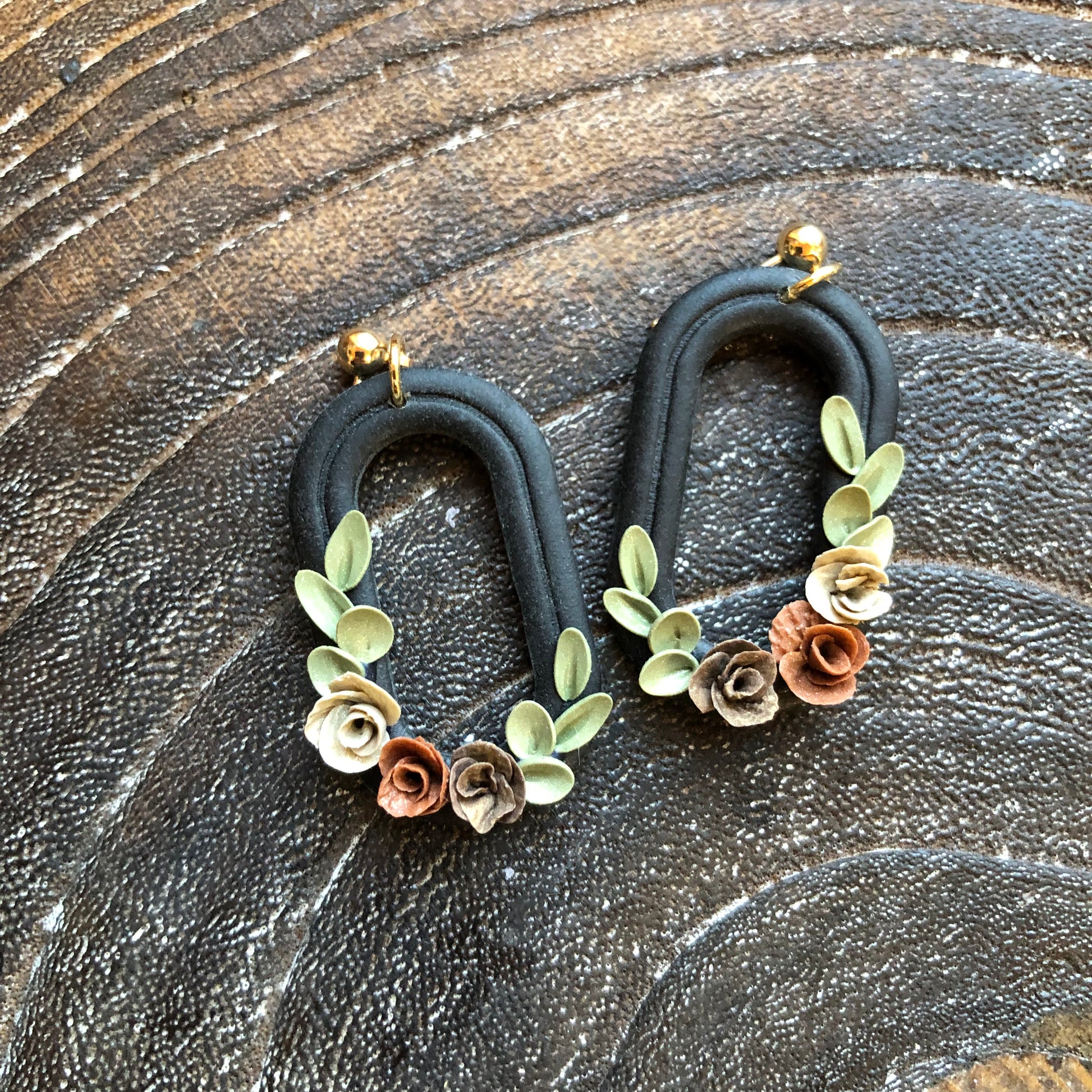 Black Autumn Floral Polymer Clay Dangles on 14k Gold Filled Posts