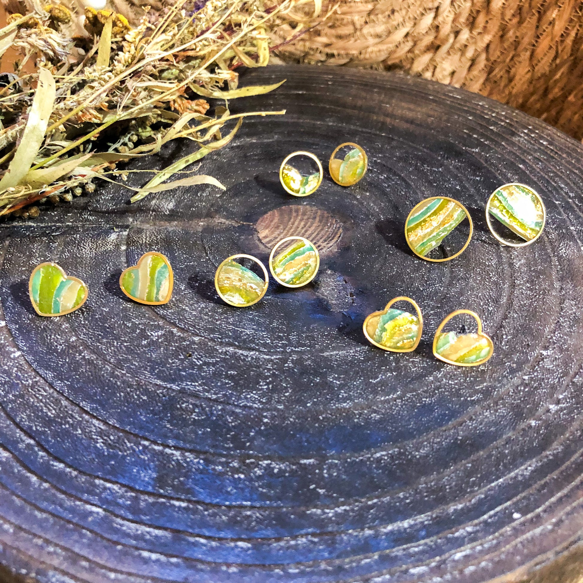Bright Earthy Faux Stone Studs with Gold Frame, Polymer Clay, Canadian Made