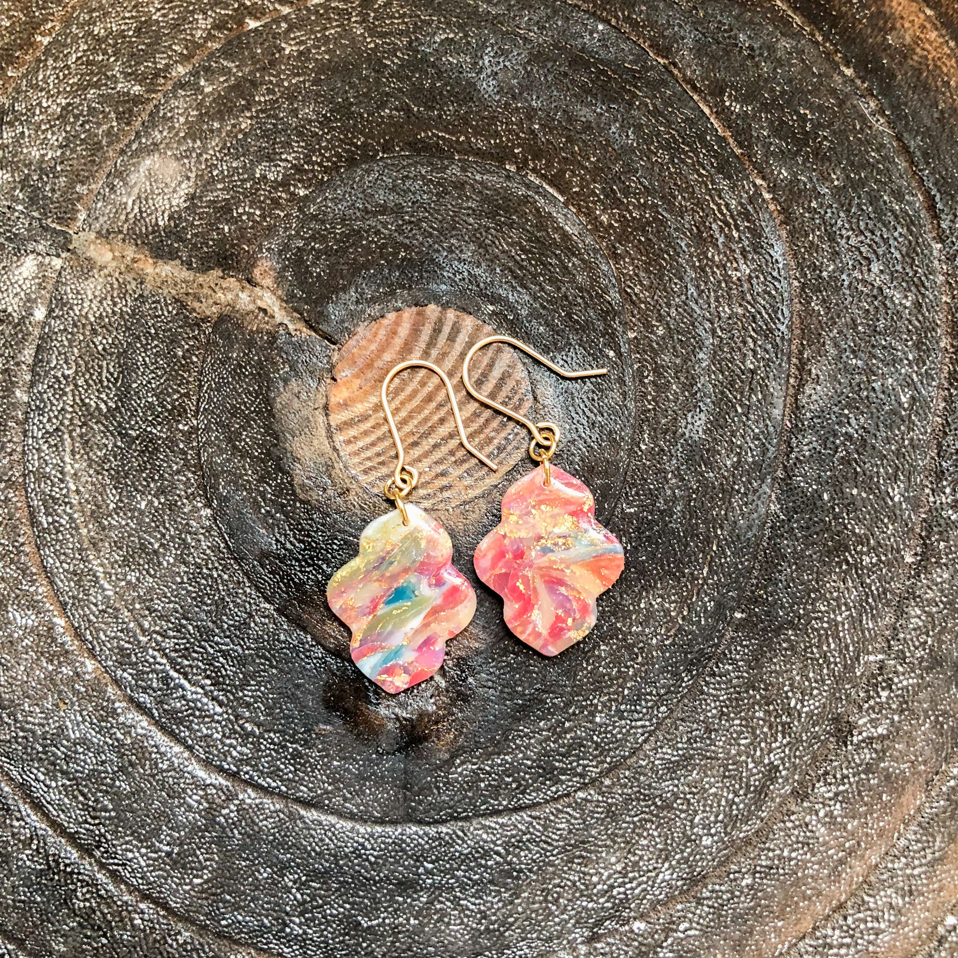 Warm shades of polymer clay marbled with gold leaf sheets, enhanced with UV Resin. The hooks are hand cut and shaped using 14k gold filled wire.