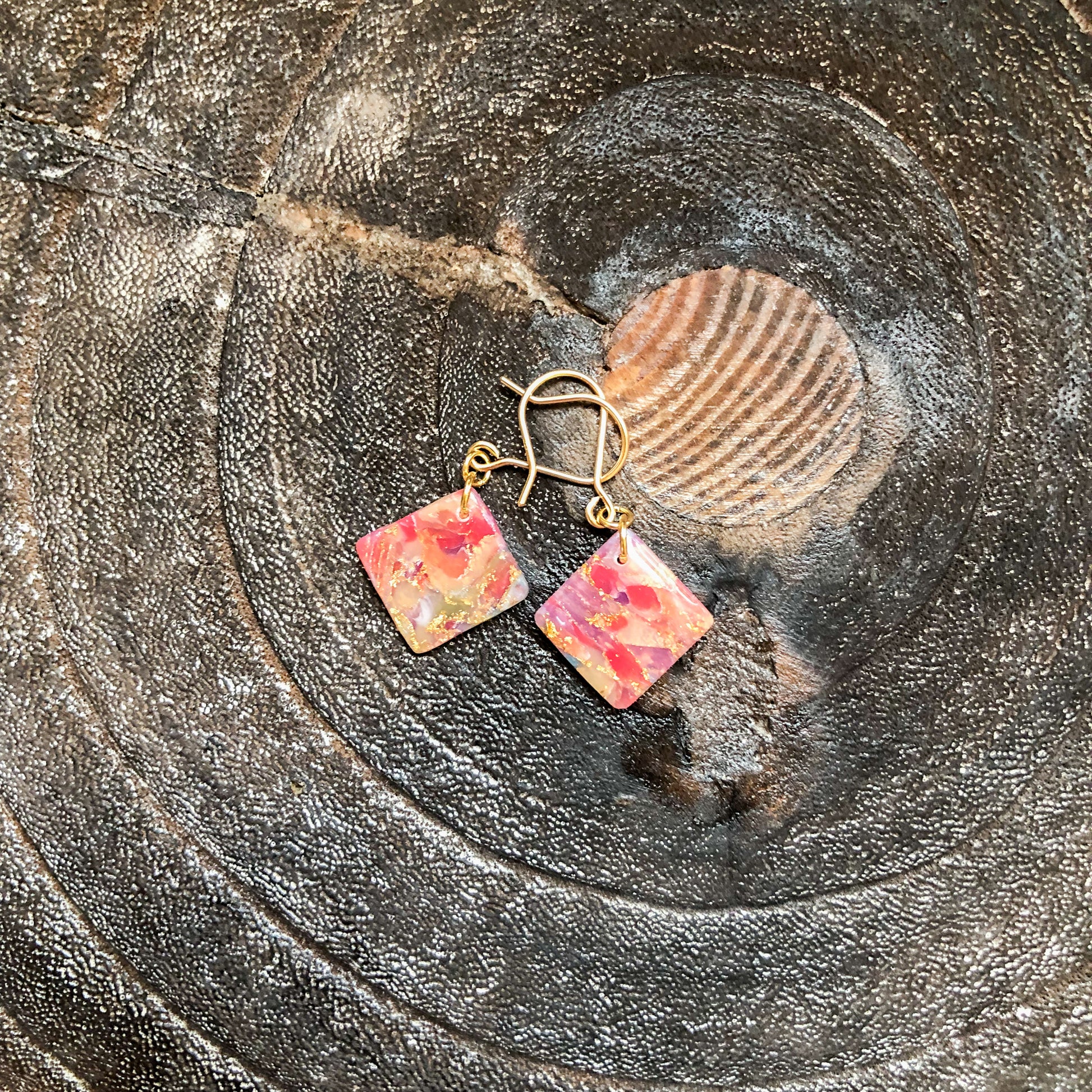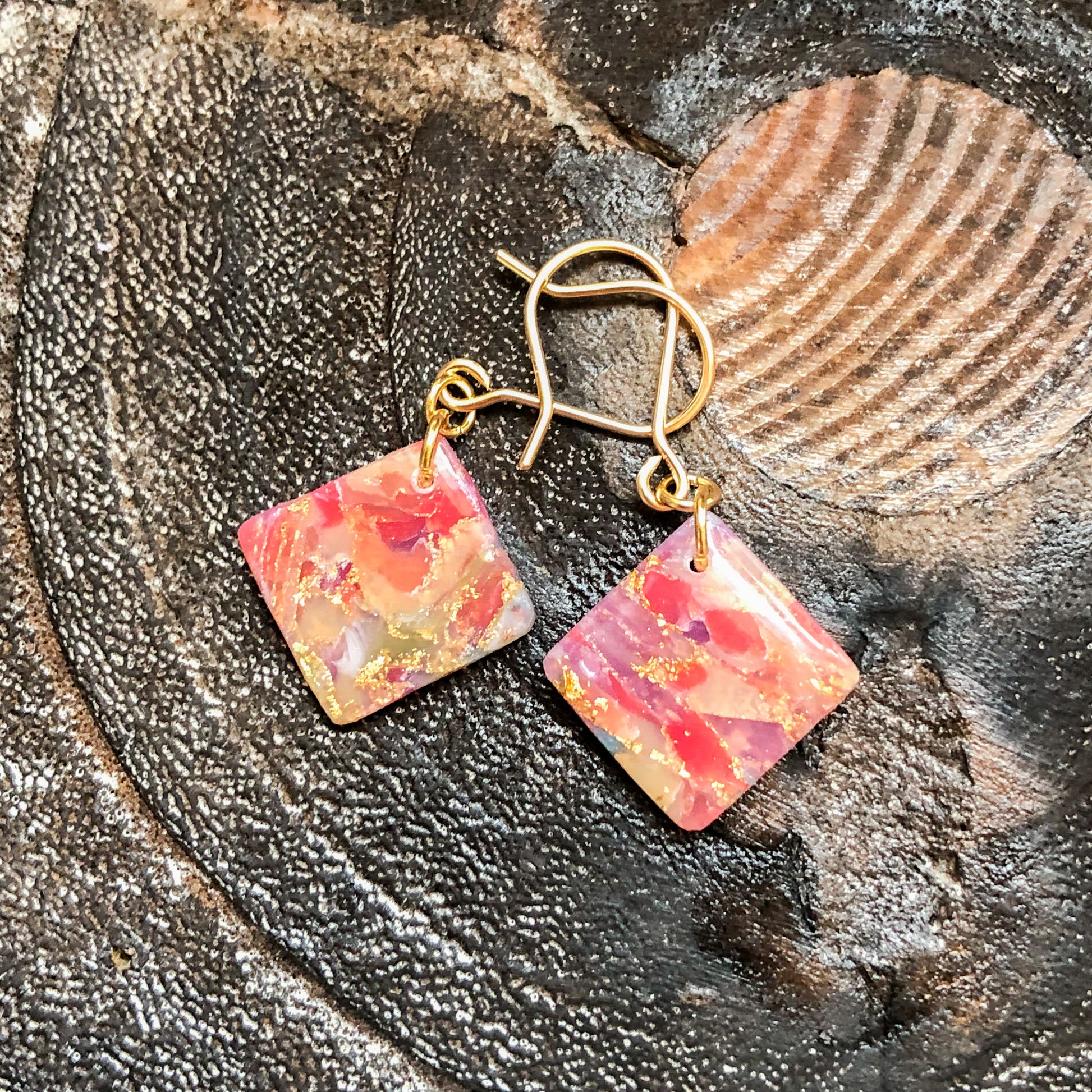 Warm shades of polymer clay marbled with gold leaf sheet, enhanced with UV resin. The hooks used are 14k gold filled wire.