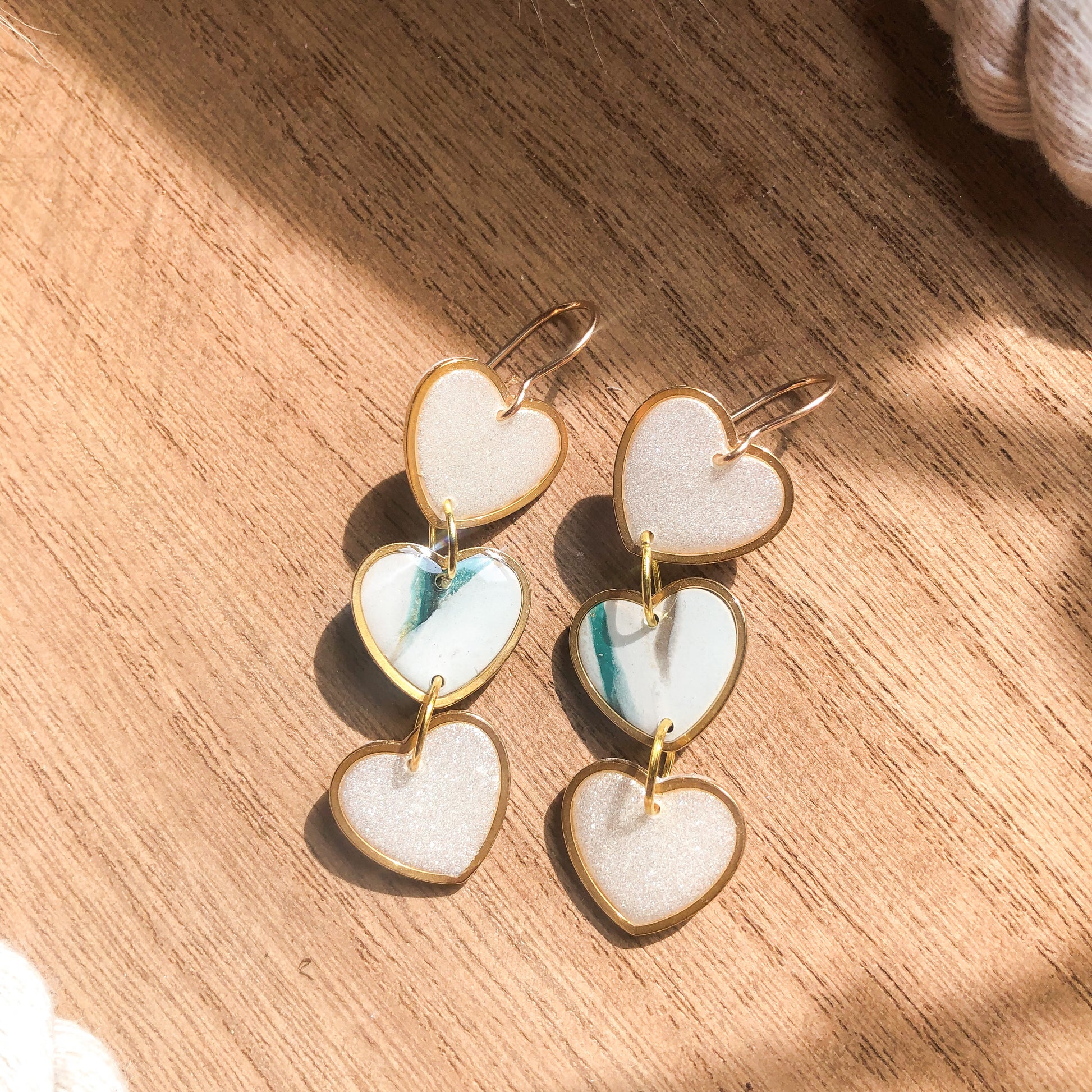 These three tiered polymer clay earrings are hand mixed for a unique design. With the middle heart a blend of white, gold and greens, and the outer hearts an iridescent white, they catch the sunlight and sparkle. Each heart is incased in gold plated stainless steel, and then coated in UV resin to enhance the look.