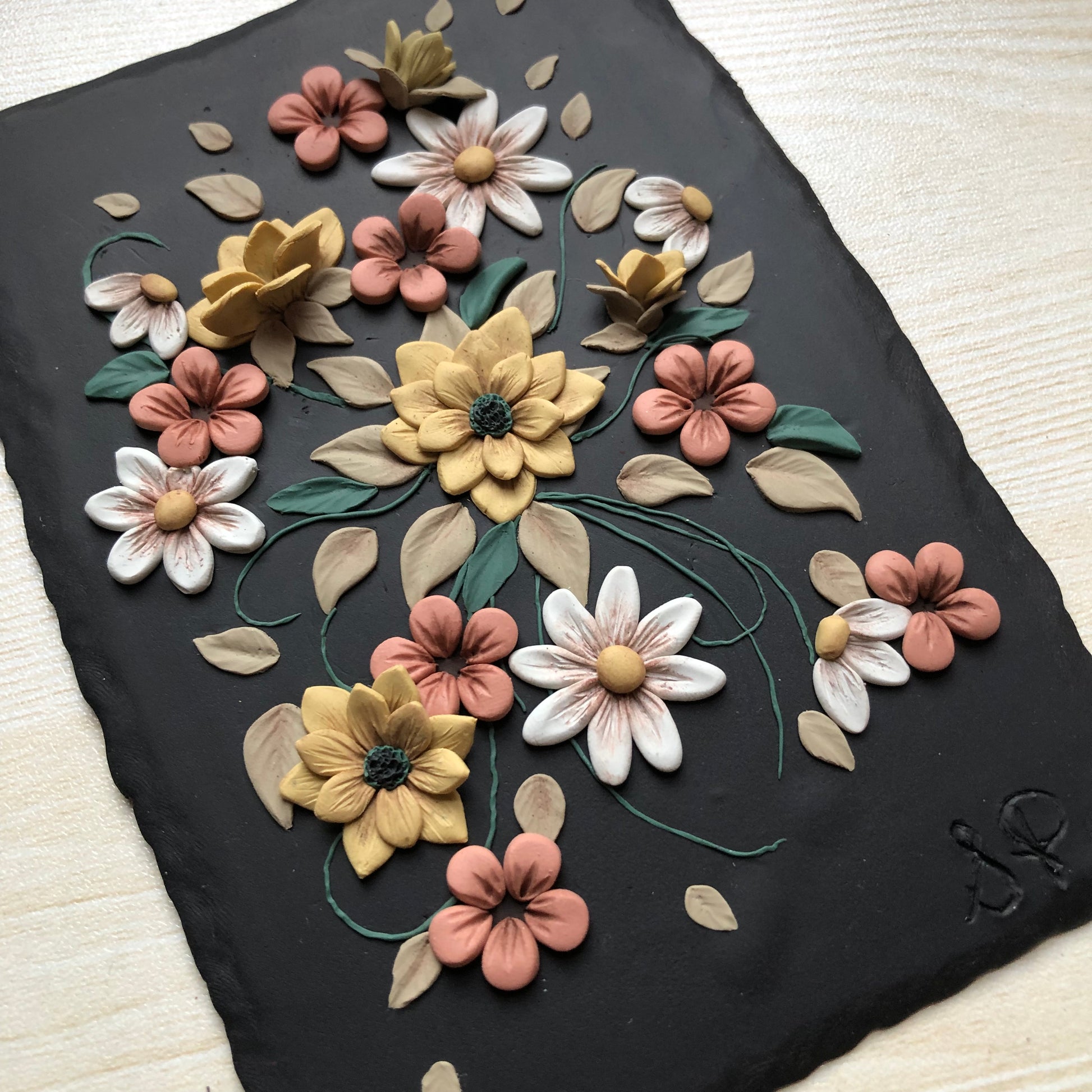 Hand mixed polymer clay has made its way to your home! This piece is hand crafted using various shades of Sculpey soufflé. The flowers are created, petal by petal, to create a fun and inviting piece of artwork. The base of the piece is designed to resemble stone, adding another touch of creativity.