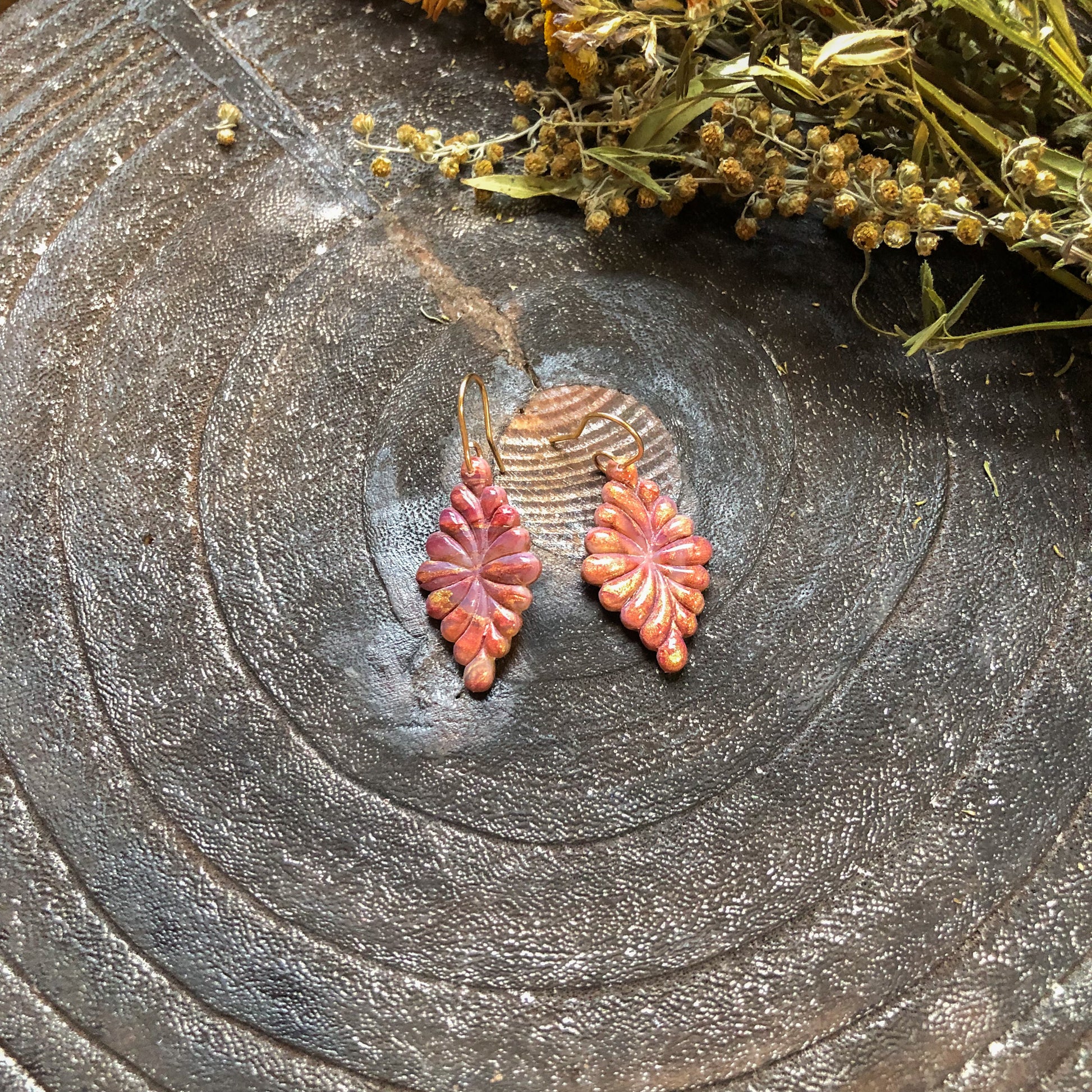 These earrings are designed and created by 8 year old Keziah, who picked out alcohol inks in Maroon, Gold, and Purplish Red, to be marbled with Translucent Clay. The pieces boast depth and intricacies in design, as you can see the layers between the colours.