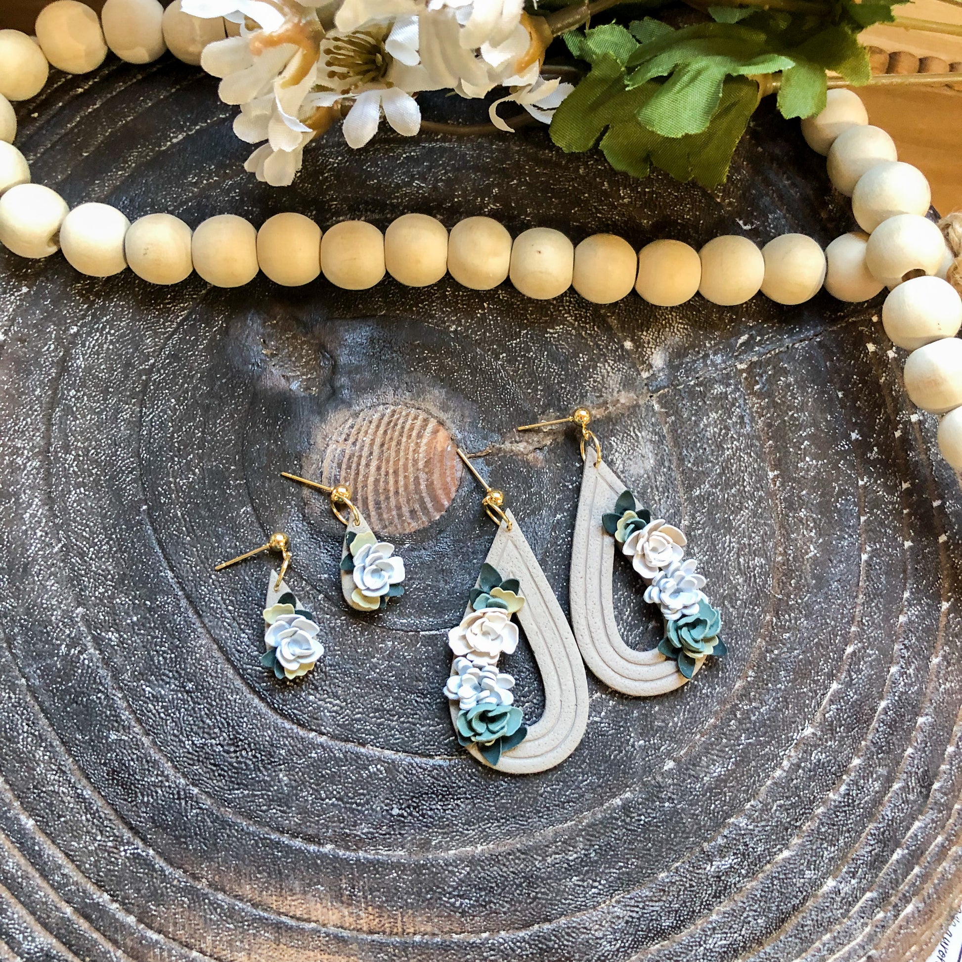 Soft neutral colours with added texture! Pick a large dangle adorned with 3 flowers, or a simpler dangle with a single flower! The ball posts are gold plated stainless steel that are hypoallergenic and tarnish resistant, making these a great option for those with sensitive skin.