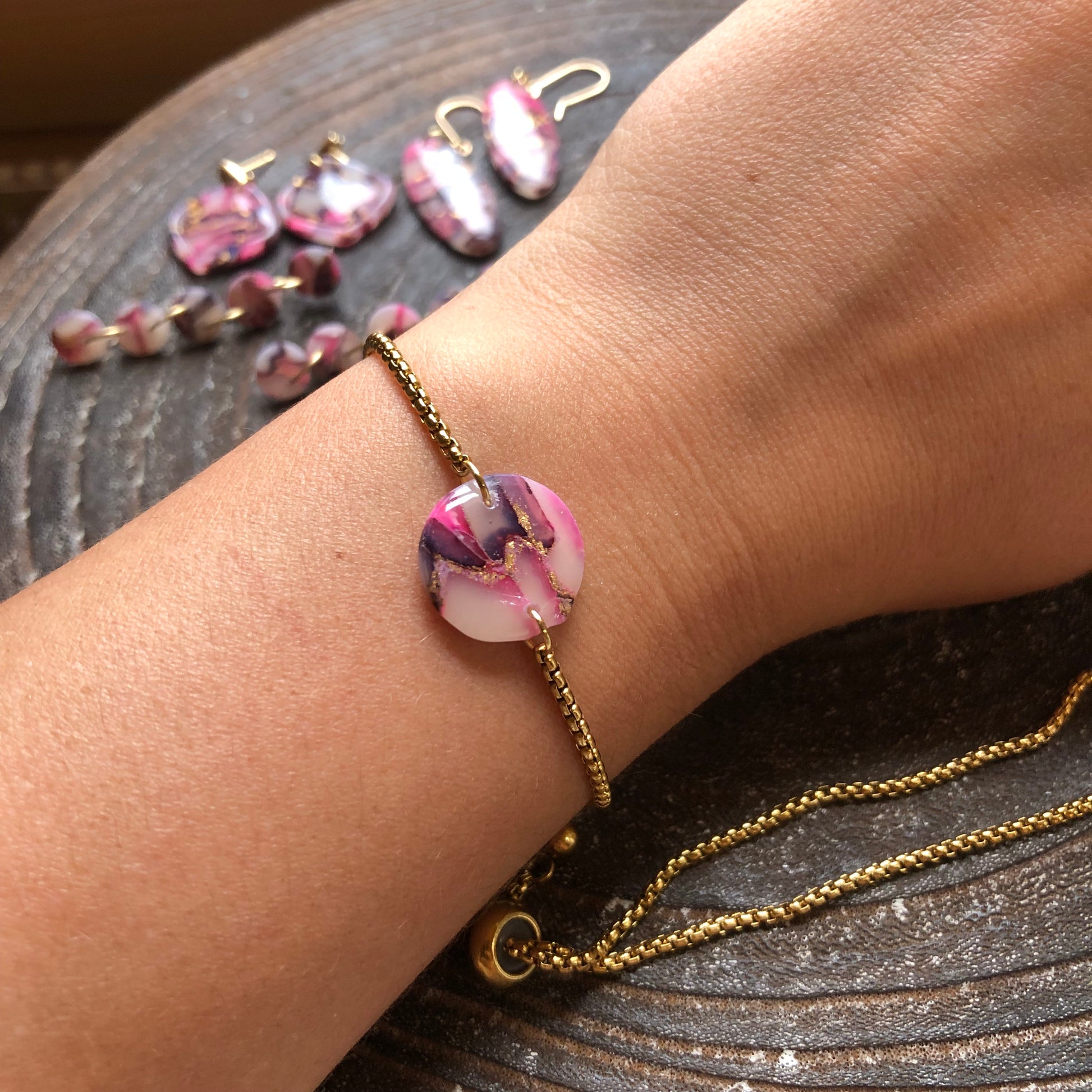 Translucent clay marbled with pink and brown alcohol ink, adorned with gold leaf sheet.