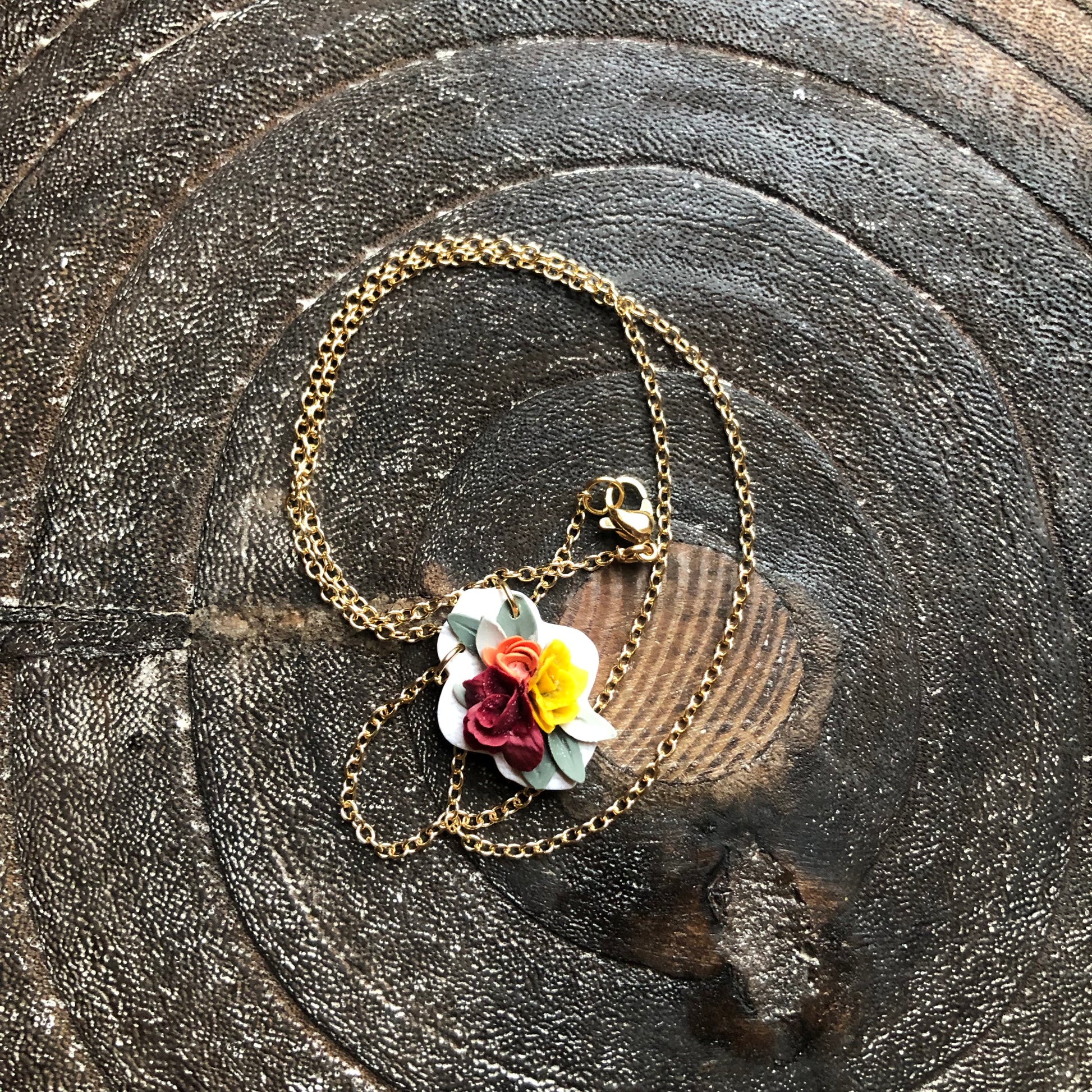 Polymer clay hand mixed in various shades to create detailed petals with depth. Each petal is hand pressed to look realistic and eye catching. The chain used is made from hypoallergenic, tarnish resistant, 14k gold filled chain.
