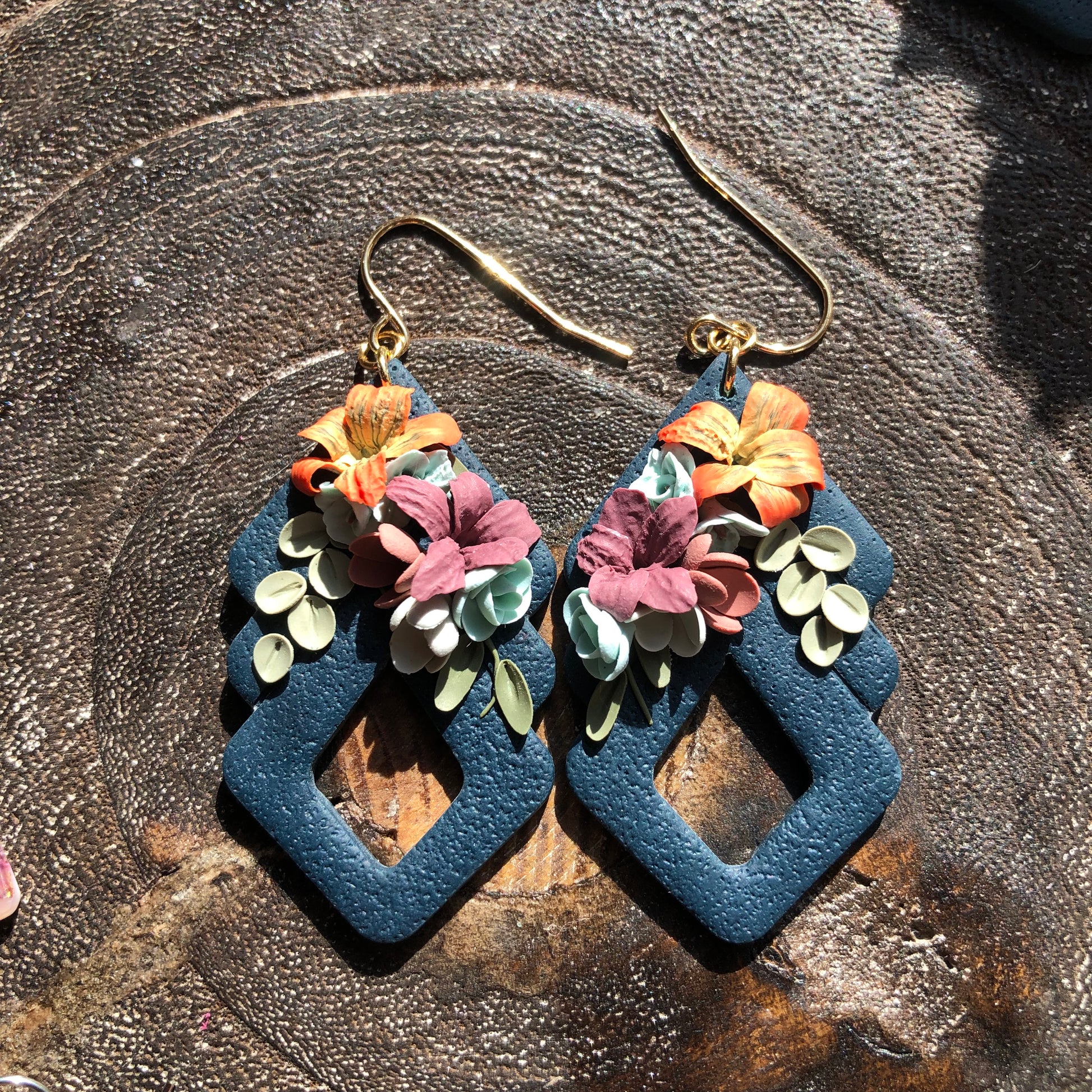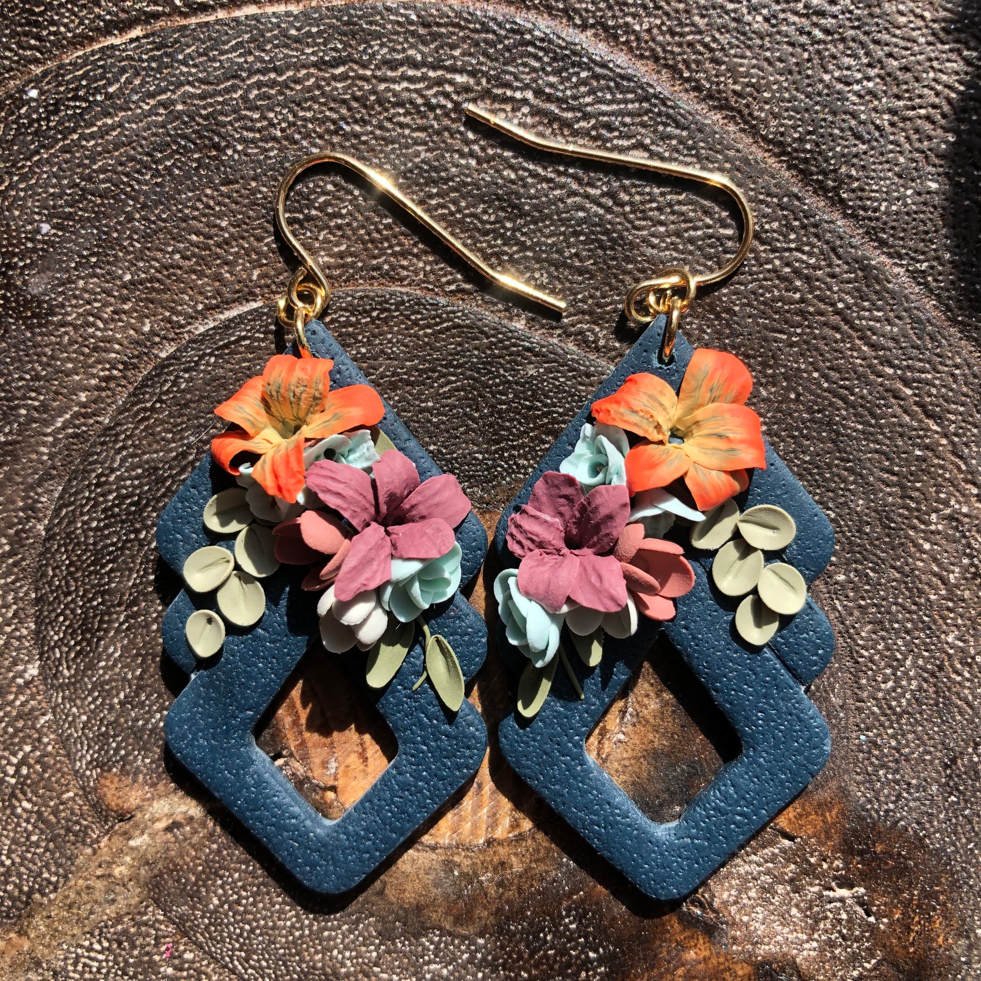 Tropical Autumn, Polymer Clay Dangle Earrings on 14k Gold Hooks